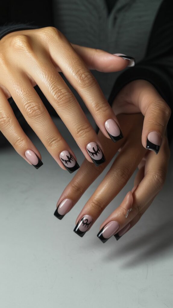 For the truly minimalist, this is your move. A perfect, glossy neutral nail—think beige, greige, or soft taupe—with one single, tiny black bat or cat silhouette on an accent nail.