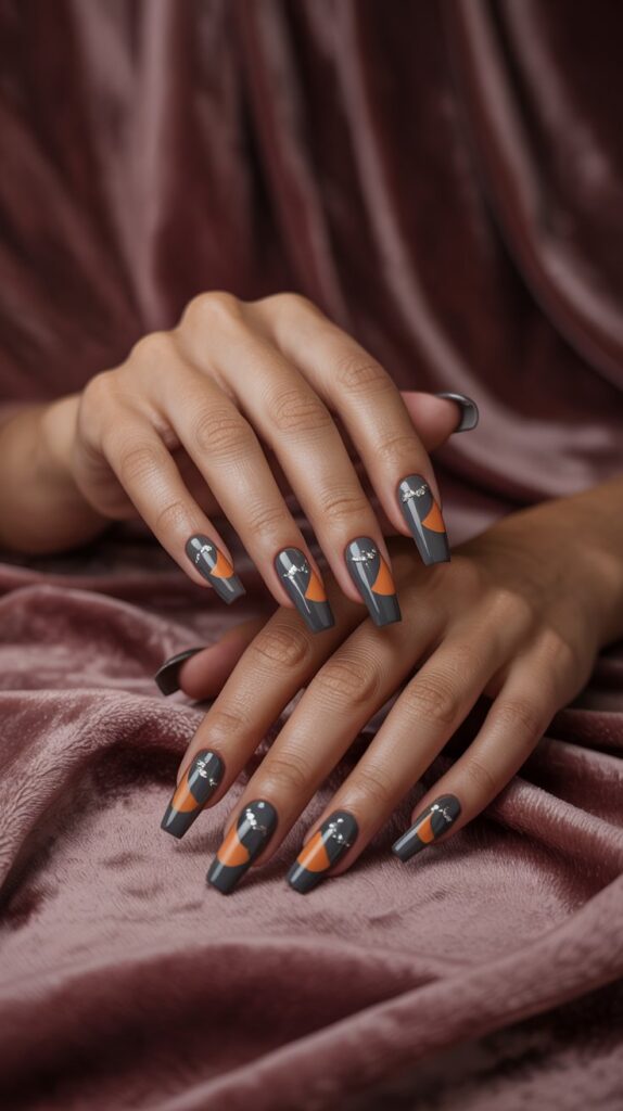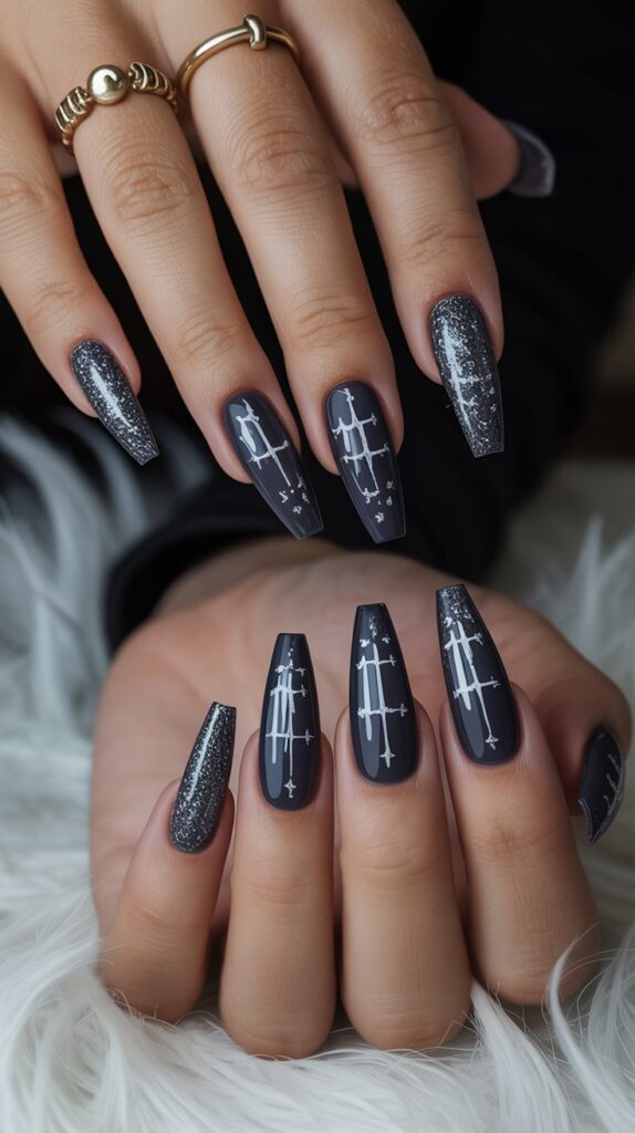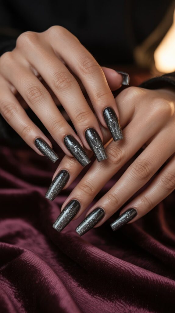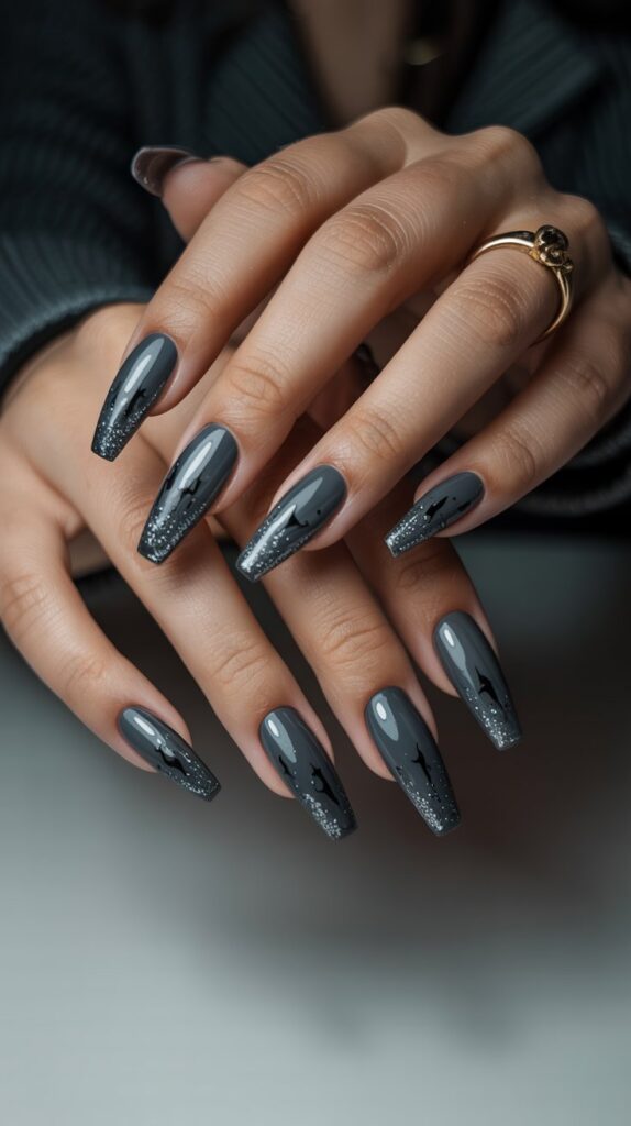 Think stormy skies with a sprinkle of stardust. This design uses a deep charcoal or black base that fades into a fine, silver micro-glitter at the tips. It’s celestial and spooky without being over-the-top.