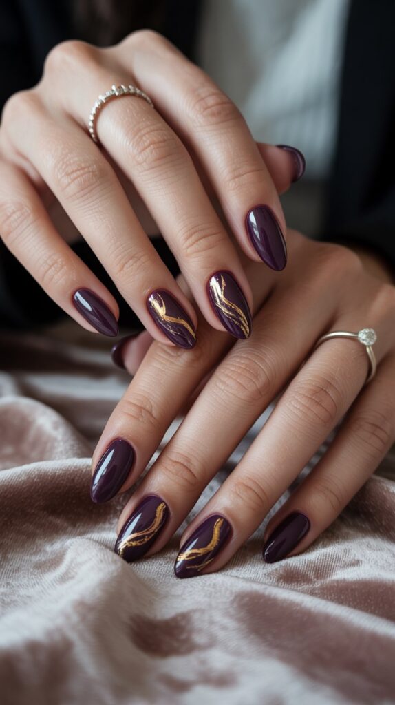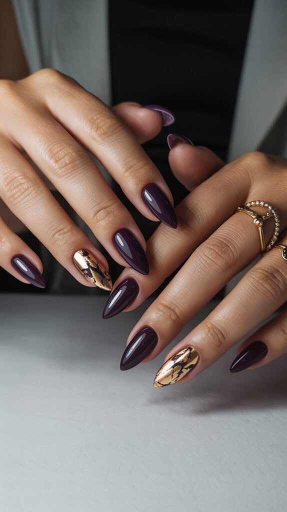 Rich, vampy plum is the color of the season. Elevate it by adding abstract patches of gold leaf foil on an accent nail or two. It gives off serious old-world, opulent witch vibes.