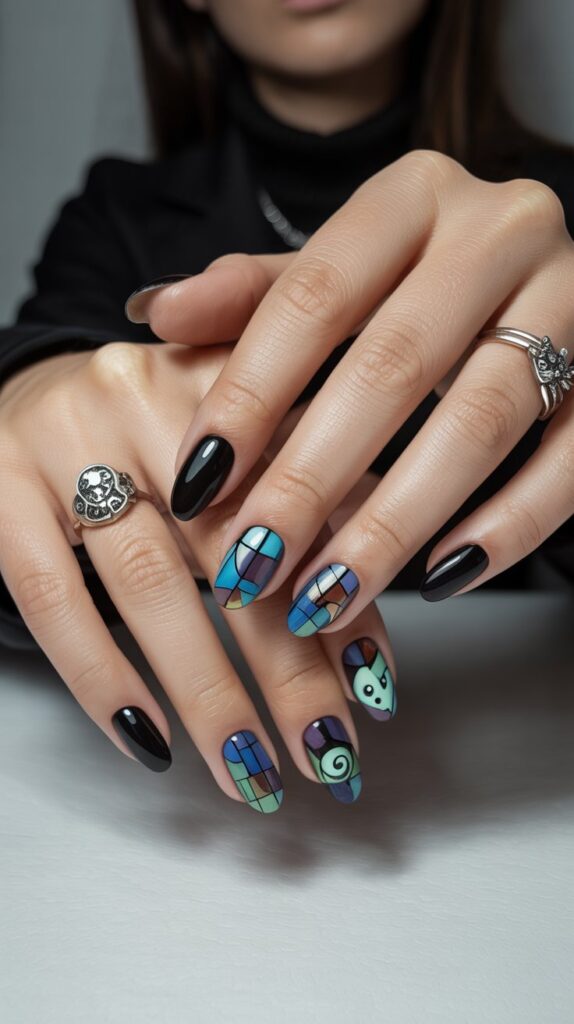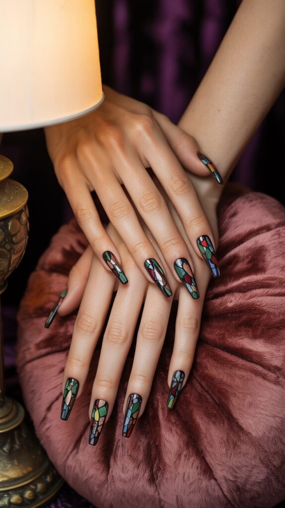 This design is for the artiste. Imagine deep emerald, sapphire, and amethyst polish colors outlined in black to look like tiny stained-glass windows on your nails. It’s a masterpiece.