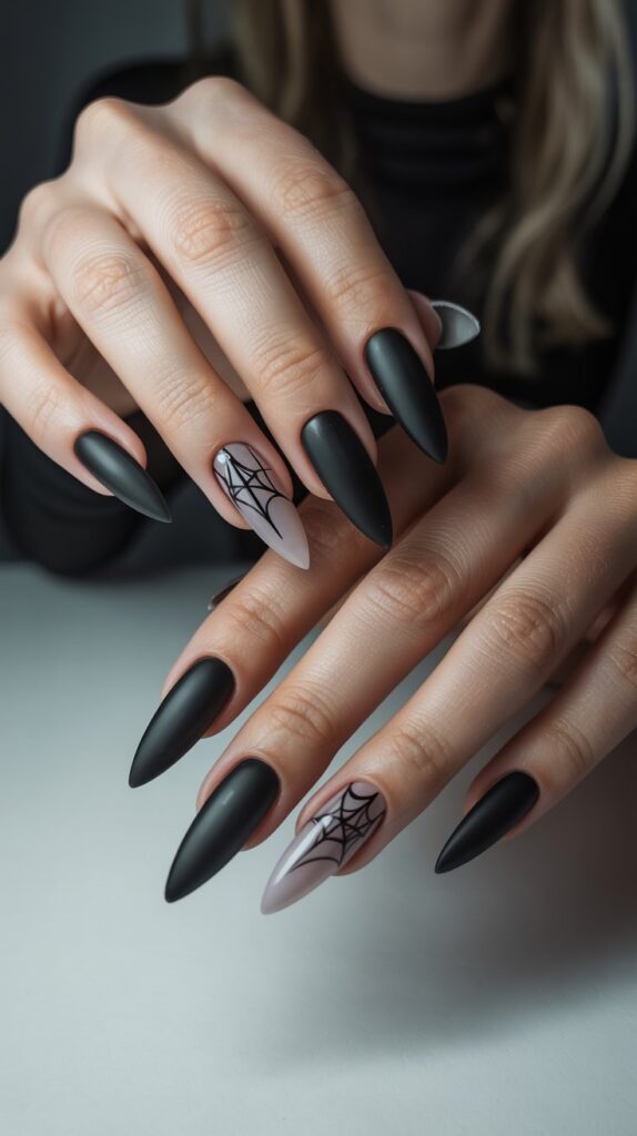 Texture play is a huge trend, and this design uses it brilliantly. A perfect matte black base on all nails, with one accent nail featuring a single, high-gloss spiderweb.